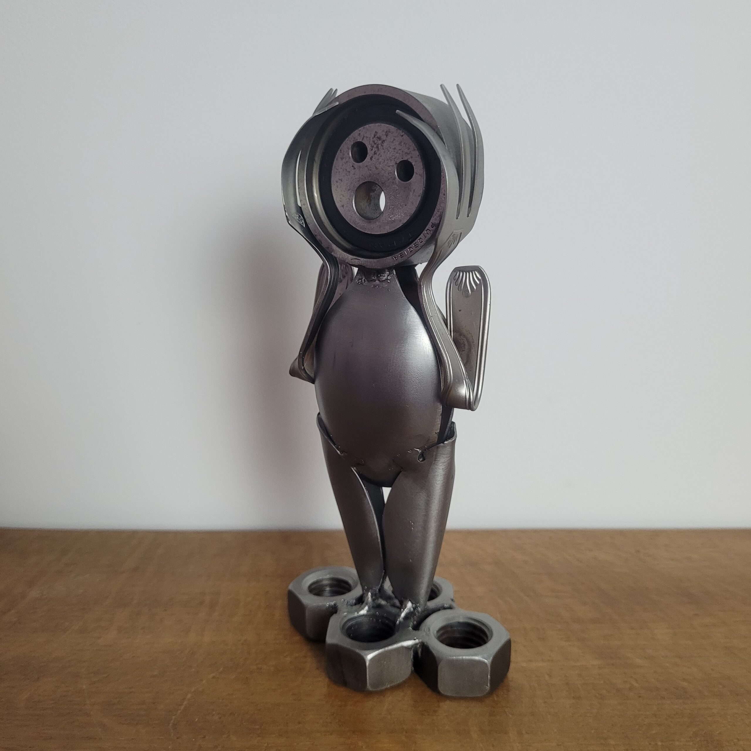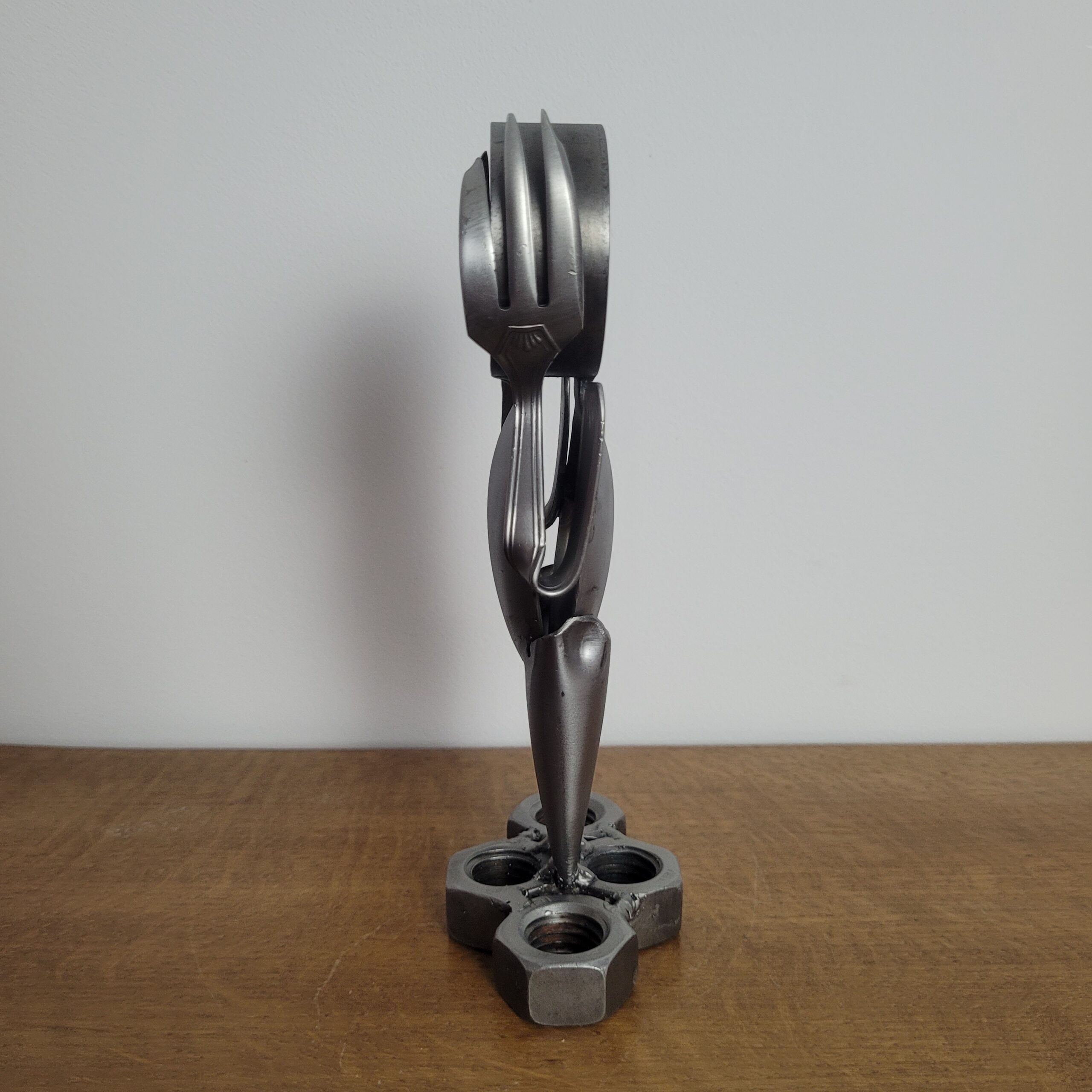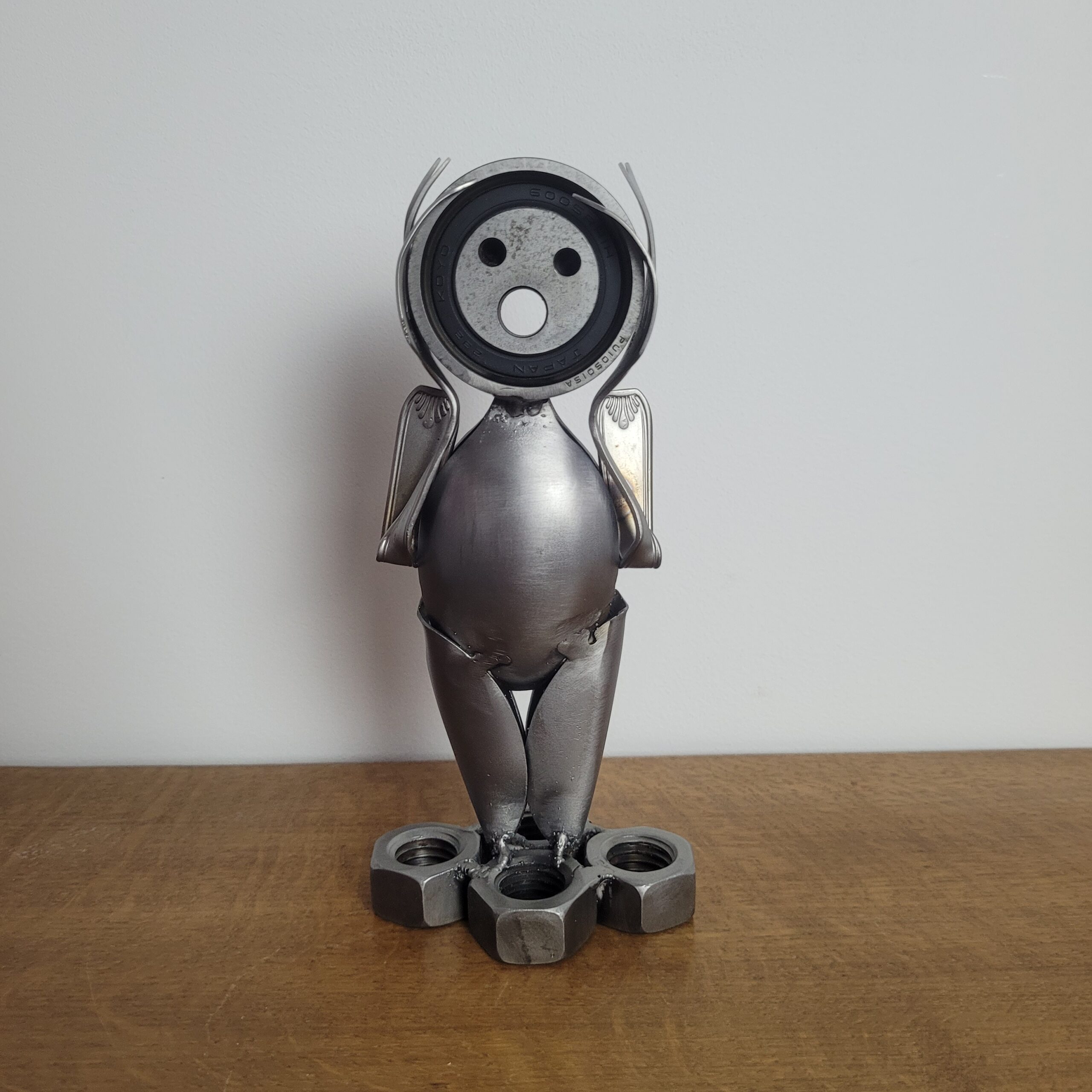Conçue à partir de métal recyclé, elle allie la force brute du matériau à la délicatesse d’une posture universelle. Son expression rappelle une figure intemporelle de l’art, symbole de stupeur et de vulnérabilité. Pourtant, cette œuvre garde sa propre identité : unique, moderne, et forgée de mes mains dans un esprit créatif libre.
