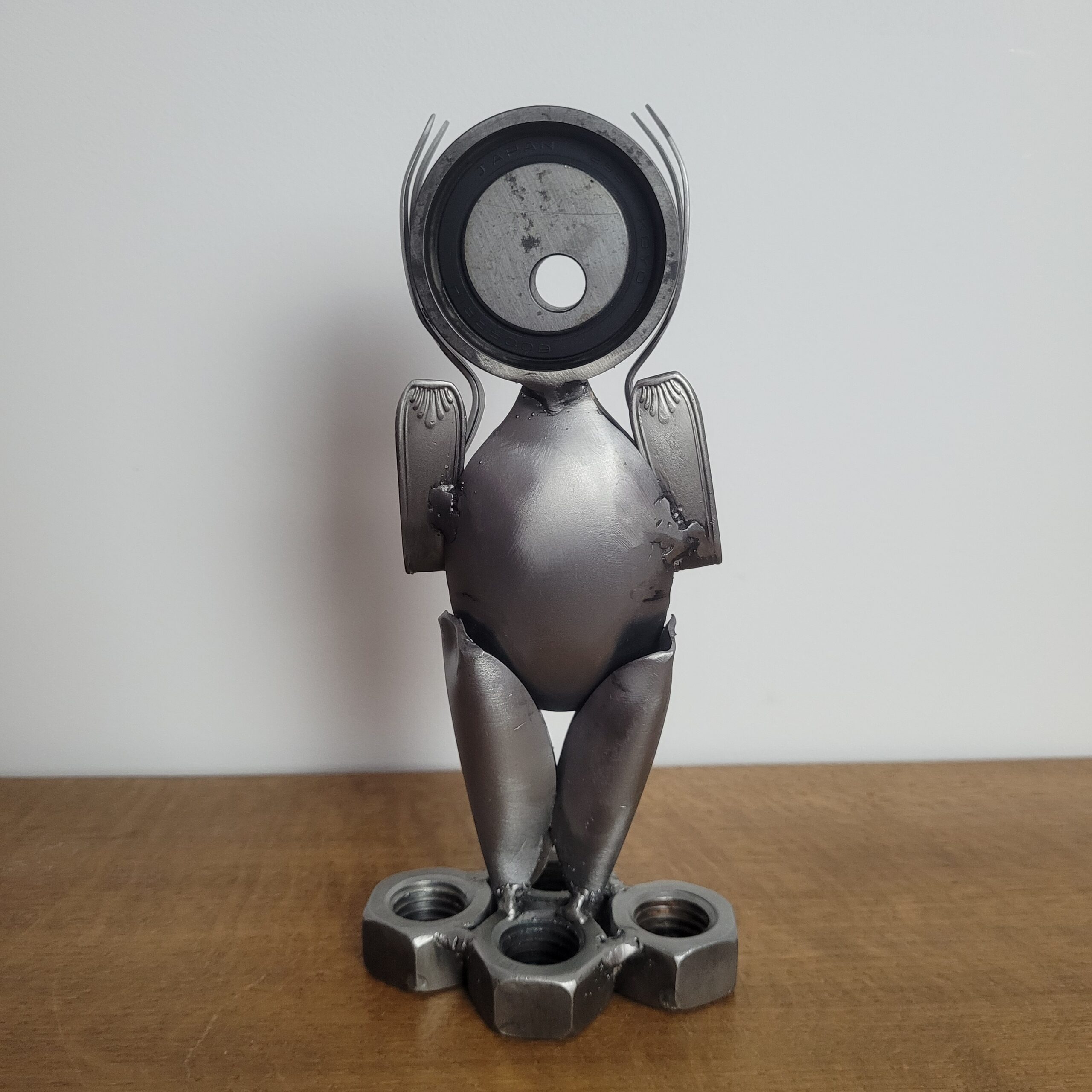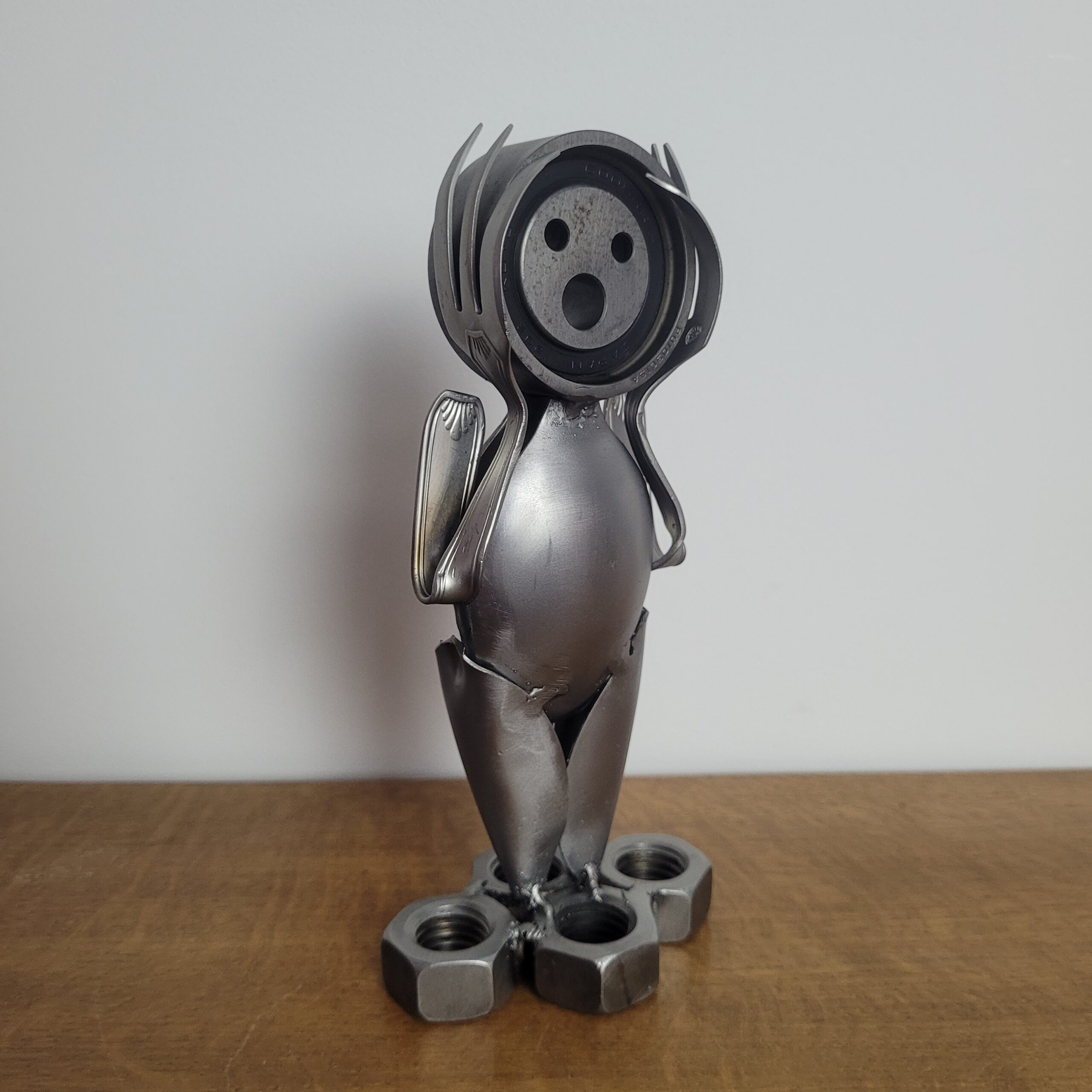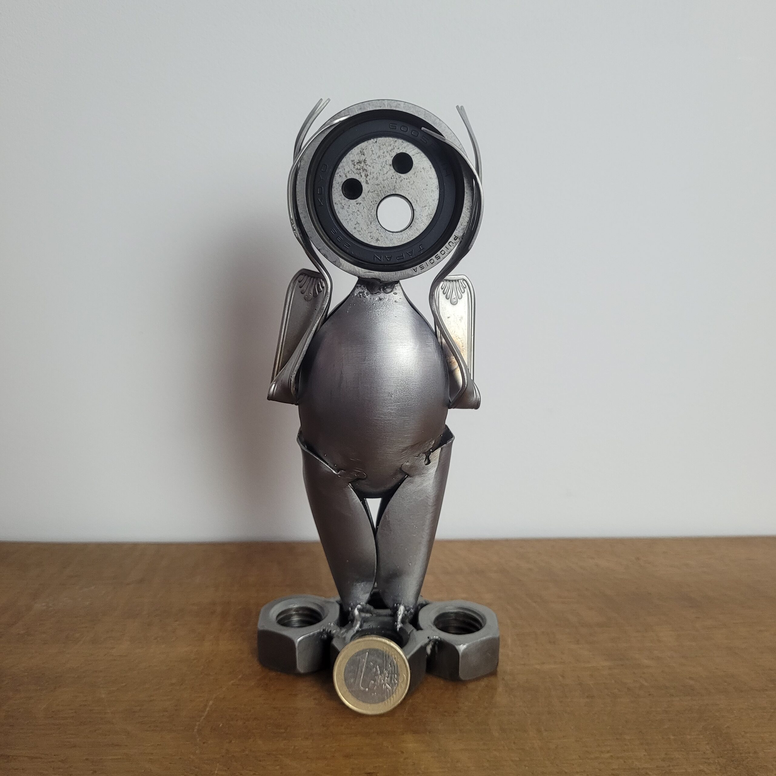 Conçue à partir de métal recyclé, elle allie la force brute du matériau à la délicatesse d’une posture universelle. Son expression rappelle une figure intemporelle de l’art, symbole de stupeur et de vulnérabilité. Pourtant, cette œuvre garde sa propre identité : unique, moderne, et forgée de mes mains dans un esprit créatif libre.