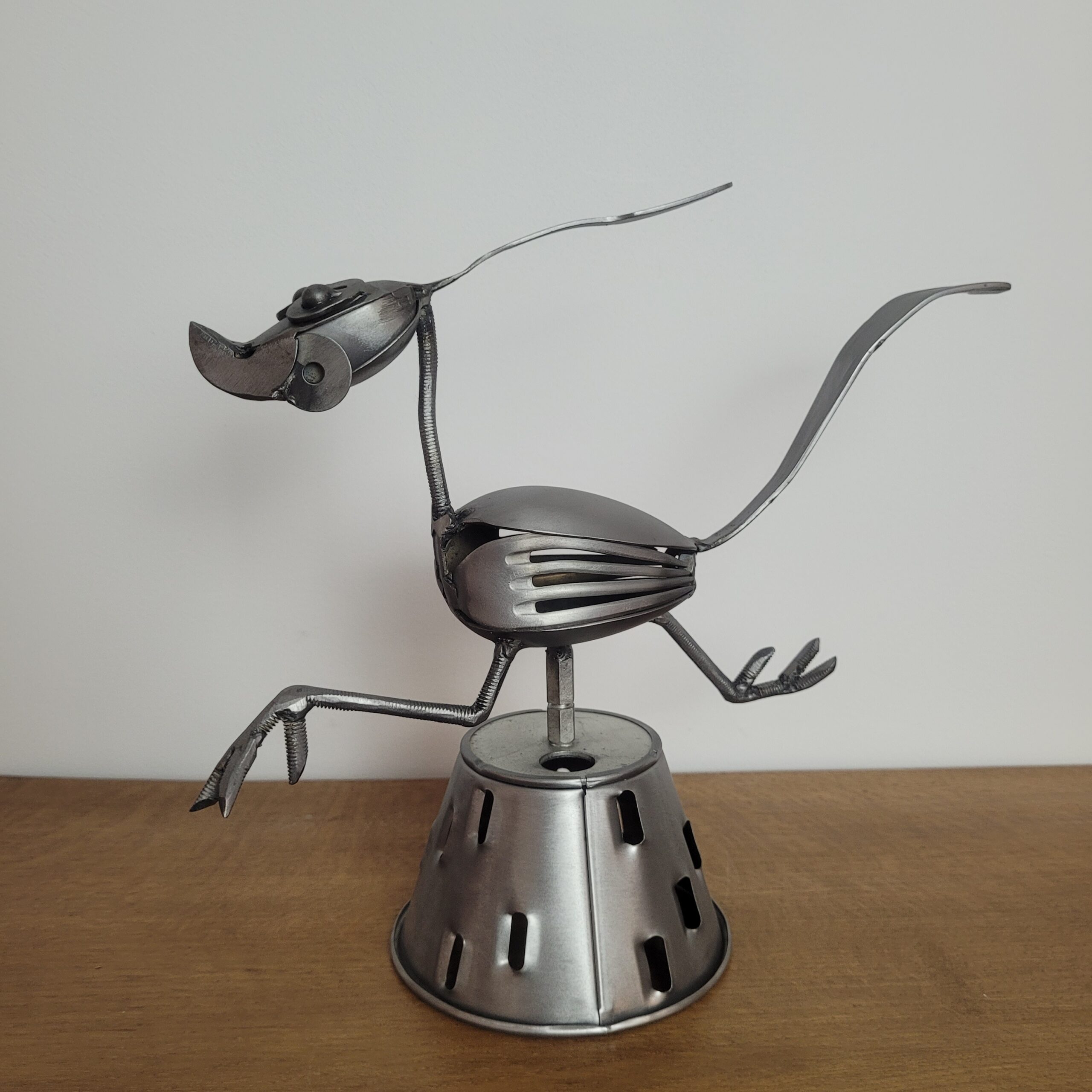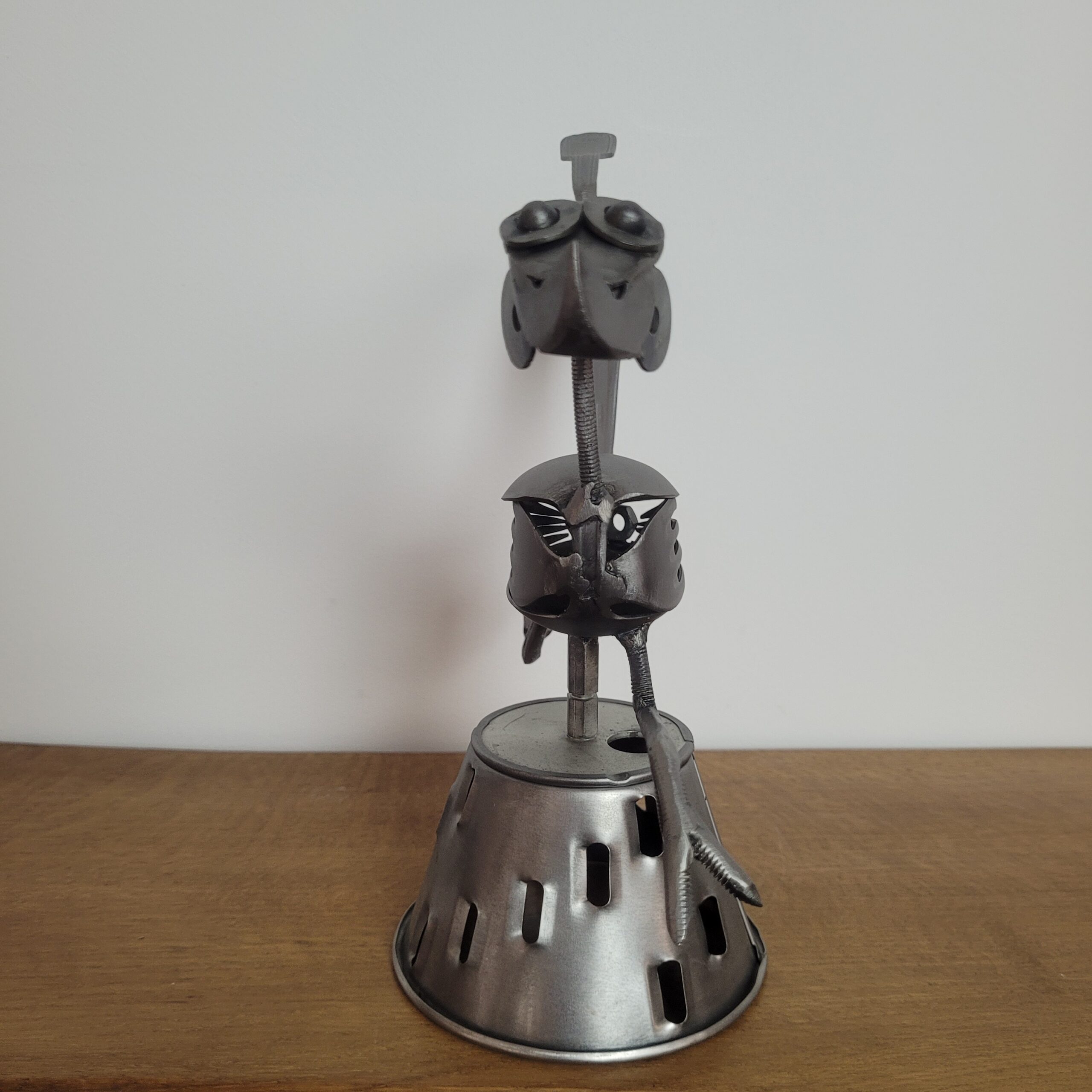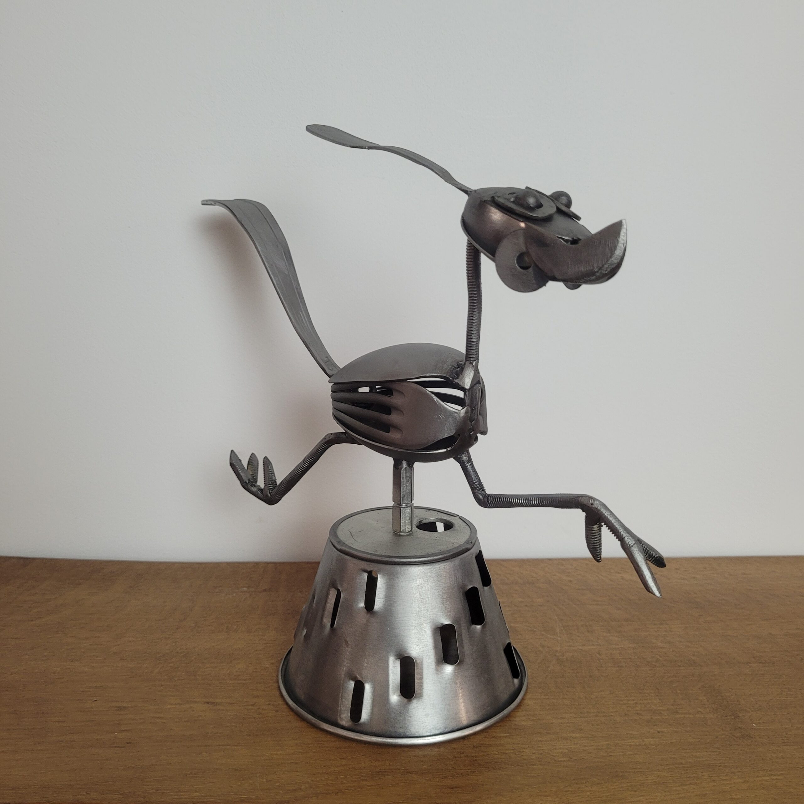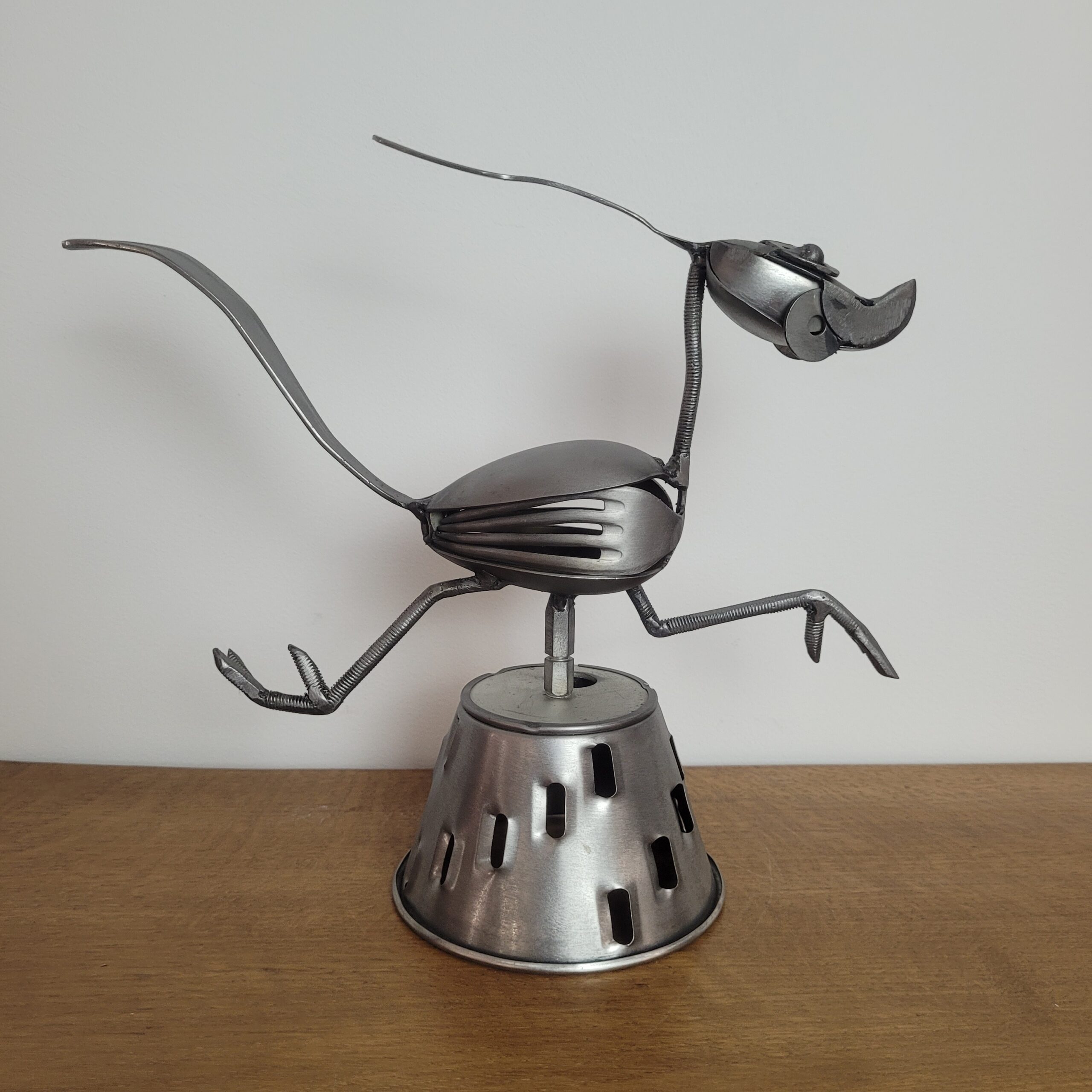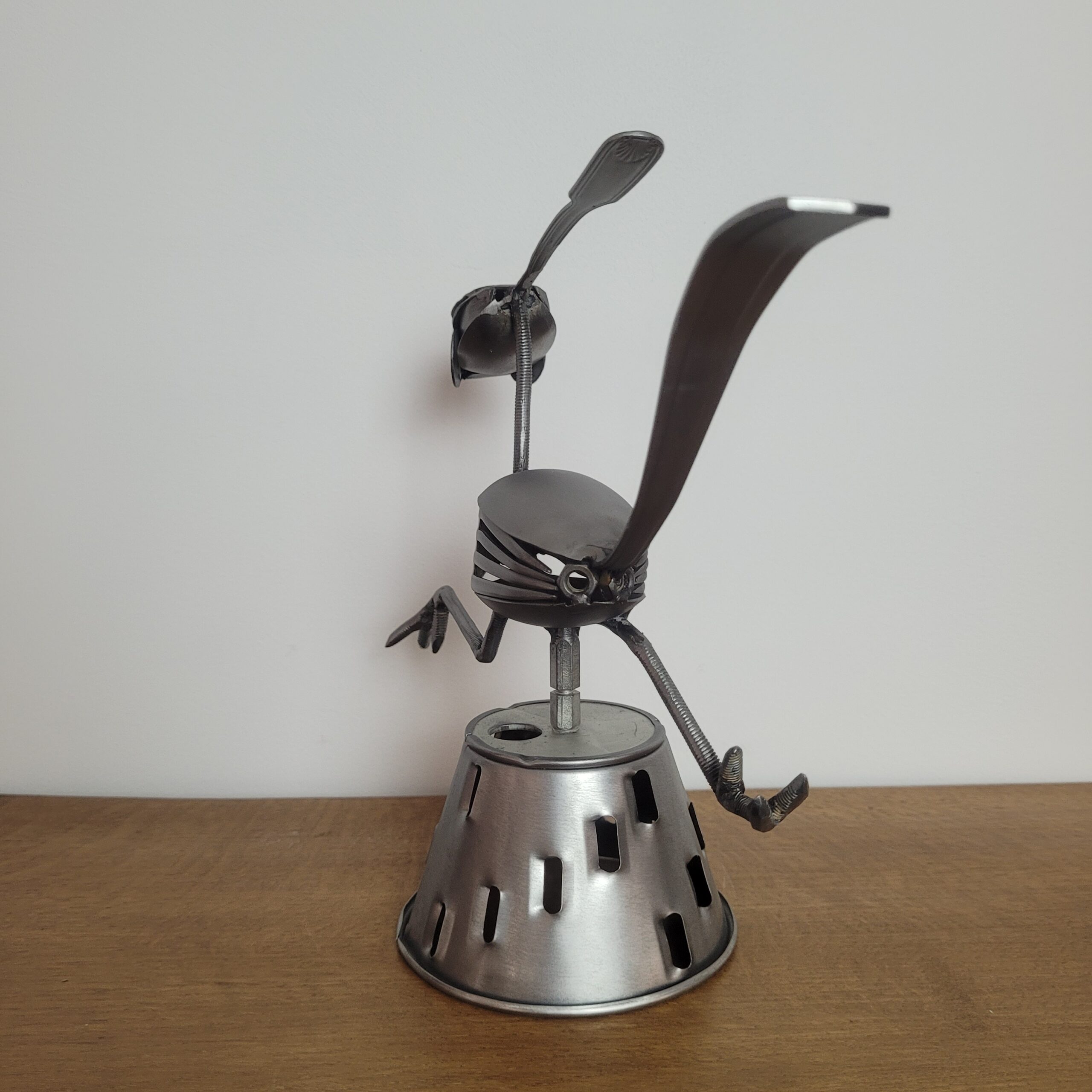 Sculpture artisanale d’un oiseau en métal recyclé, capturée dans un mouvement vif et espiègle. Réalisée à partir de pièces de récupération, elle apportera dynamisme et originalité à votre décoration.